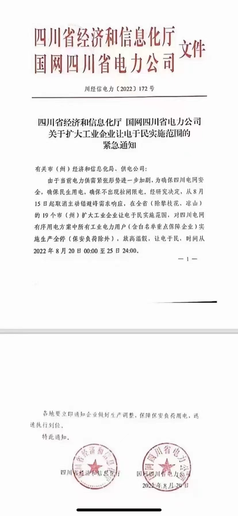 由于今年四川的氣溫超過自1961年來有完整氣象記錄的最高溫,且持續時間長,再加上降雨量與同期相比大幅減少,水電豐富的川渝地區遭遇嚴峻的電力供給緊張局面挑戰。原計劃于8月20日結束的限電停產計劃因高溫天氣持續、供電負荷緊張,由省經信廳和國網四川電力公司于8月20日再次發布川經信電力【2022】172號文件,要求工業企業繼續限電停產讓電于民,時間從8月20日00:00-25日24:00。